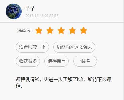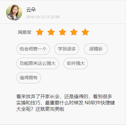 課程得到了大家的認(rèn)可,滿意度也非常高!讓用戶找到了自己所用N8軟件的價(jià)值感和自信心,同時(shí)也延續(xù)了每一位用戶學(xué)員對(duì)N8的那份熱愛(ài)和新鮮感。